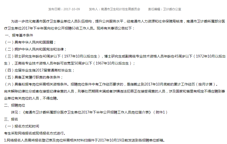1.《南通市卫计委所属部分医疗卫生单位2017年下半年公开招聘工作人员岗位简介表》