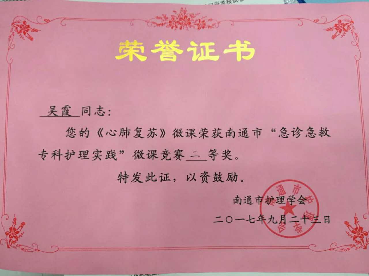 首届急诊急救专科护理微课竞赛共收到作品47个,通过专家初评,有12个优秀作品进入决赛,进行大会现场交流。经过激烈的角逐,我院急诊科吴霞的“心肺复苏”微课讲授荣获二等奖。