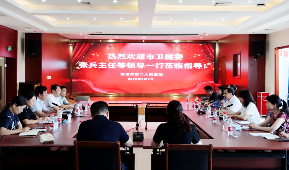 7月5日,南通市卫健委党组书记、主任张兵,党组副书记、副主任张莉华及相关处室负责人一行莅临我院调研指导,ag真人领导班子全体成员及相关职能科室负责人陪同调研。