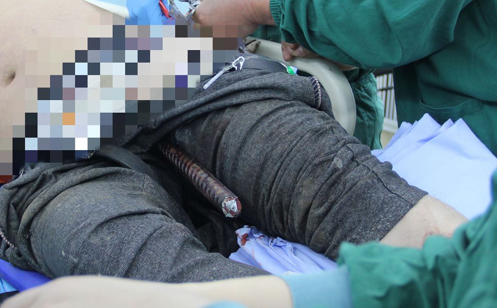 3月27中午12点50分,一位从高处跌落,钢筋贯穿伤的伤者被送至ag真人 急诊科。患者送到ag真人时,只见一根直径约2厘米粗的钢筋露在体外,裸露的钢筋长达20多厘米;钢筋从其左侧大腿内侧刺破皮肤插进盆腔。该伤者正是朱先生,他是一名建筑工人,中午在陈桥某工地施工过程中不慎从3米高处摔落,导致钢筋刺入体内。