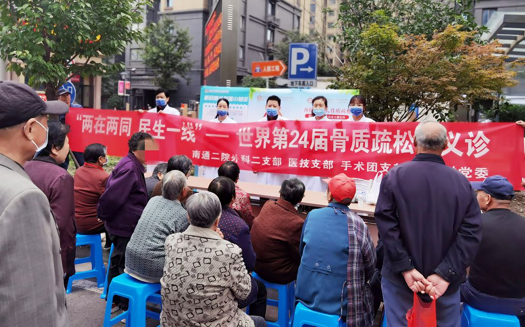 (南通大学附属康复ag真人)外科二党支部、医技党支部和手术团支部的志愿者们前往国庆村党群服务中心举行了“两在两同,民生一线——第24届世界骨质疏松日”义诊活动,用实际行动服务社区居民和骨质疏松患者。